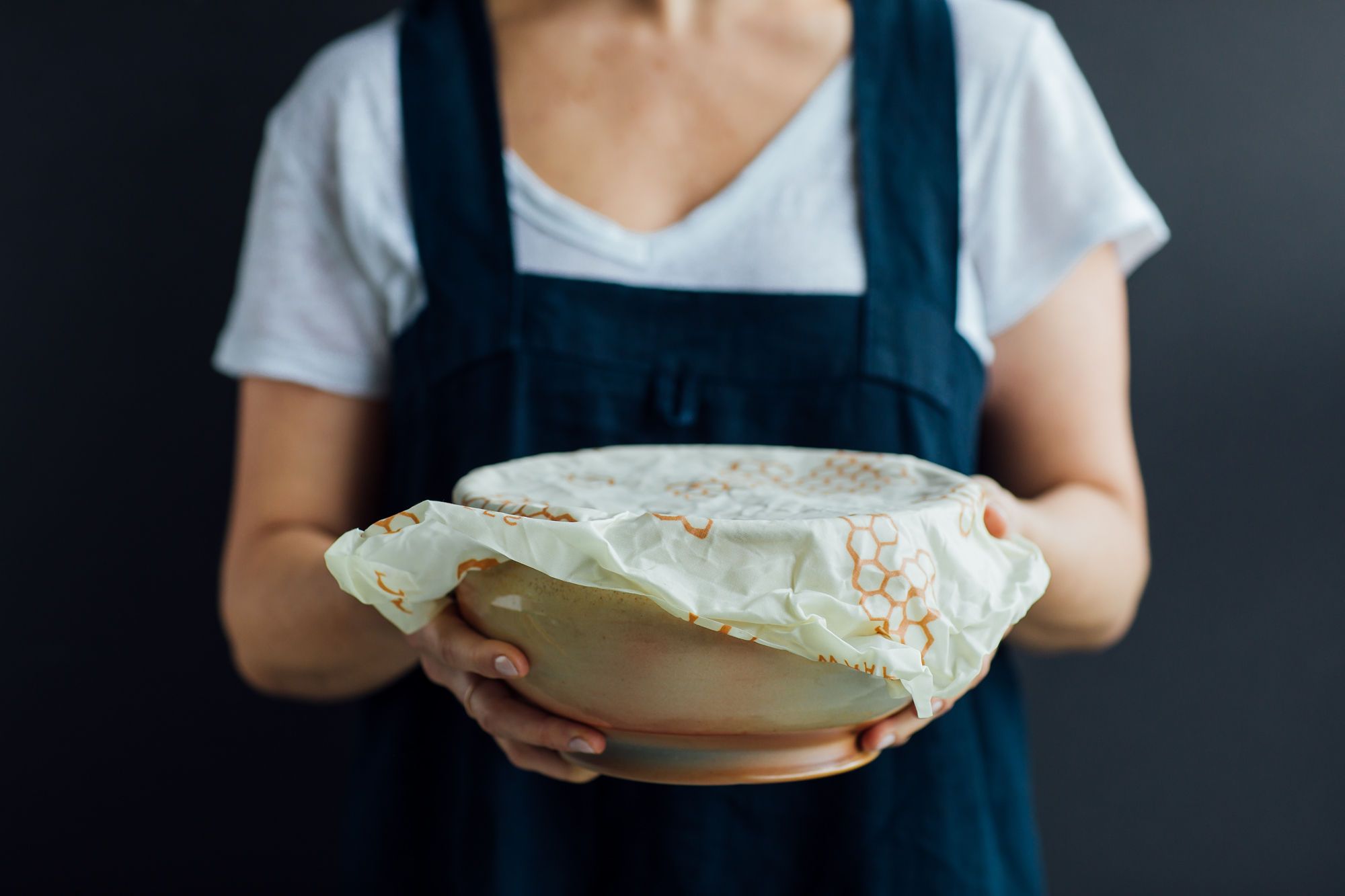 Door de warmte van je handen smelt de bijenwas een beetje en kun je de doek vormen en bijvoorbeeld om een schaal of fles heen doen. Druk de randen rustig en stevig aan zodat hij goed blijft plakken. Zorg er wel voor dat de overhangende rand groot genoeg is, zodat de doek ook de mogelijkheid krijgt om goed te plakken. Is de doek te klein voor die speciale schaal, dan gaat het plakken niet lukken helaas. Neem dan een doek van een maatje groter, zodat het wel goed afgedekt kan gaan worden.