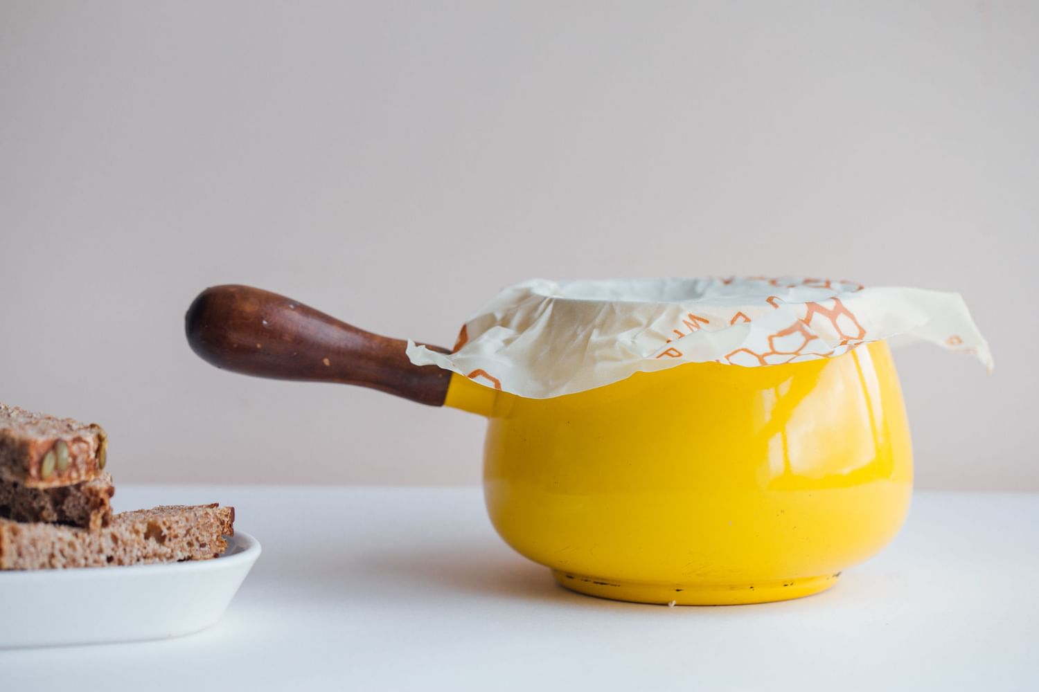 Door de warmte van je handen smelt de bijenwas een beetje en kun je de doek vormen en bijvoorbeeld om een schaal of fles heen doen. Druk de randen rustig en stevig aan zodat hij goed blijft plakken. Zorg er wel voor dat de overhangende rand groot genoeg is, zodat de doek ook de mogelijkheid krijgt om goed te plakken. Is de doek te klein voor die speciale schaal, dan gaat het plakken niet lukken helaas. Neem dan een doek van een maatje groter, zodat het wel goed afgedekt kan gaan worden.