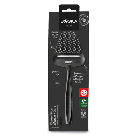 Deze prachtige zwarte kaasschaaf Monaco+ Dark van Boska is niet alleen een blikvanger door zijn donkere kleur, maar ook perfect voor het schaven van elke kaassoort. Vaatwasserbestendig en met een uniek non-stick diamantpatroon.
