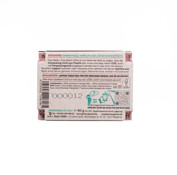 Toepassing: -> Doekje & reiniger bevochtigen -> Wrijf over de vaste reiniger tot deze schuimt -> KLAAR! (Je kunt me ook tussen je handen wrijven onder stromend water, dus ik geef mezelf aan je afwaswater. Maar het meest effectief ben ik als je me oppakt met je doek en me direct over je vaat wrijft!